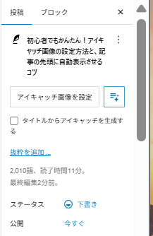 編集画面の右側にあるサイドバーから、アイキャッチを設定します。