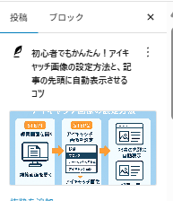 (「ブロック」になっている場合は「投稿」をクリック) - 下の方にスクロールして、「アイキャッチ画像」 の項目を探す