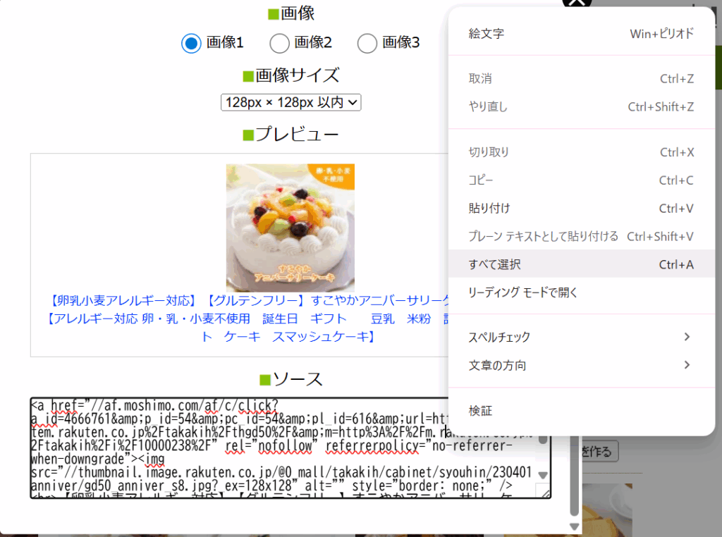 ※ソースの下がHTMLタグ、HTMLタグ部分を右クリック→「すべてを選択」をクリック→右クリック後、コピーをクリック
