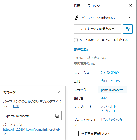 - 記事編集画面 → 右側メニューの 「URLスラッグ」 をクリック
